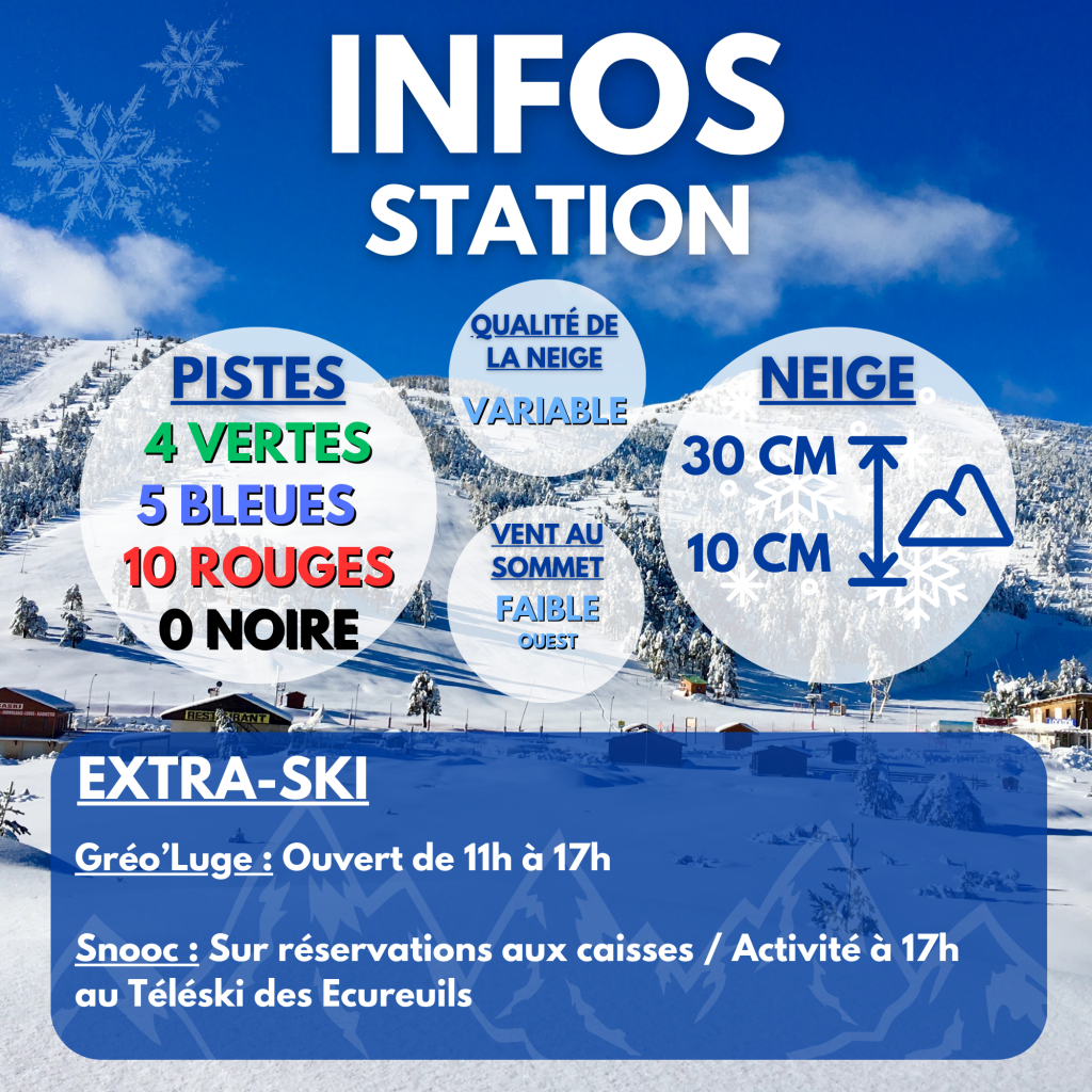 Du 20/12/2025 au 04/01/2026 tous les jours de 17h à 18h. Sur réservation aux caisses des remontées mécaniques avant 16h ou par téléphone. Du 10/01 au 08/02/2026 le vendredi et samedi de 17h à 18h. Sur réservation aux caisses des remontées mécaniques avant 16h ou par téléphone. Du 14/02 au 01/03/2026 tous les jours de 17h30 à 18h30. Sur réservation aux caisses des remontées mécaniques avant 16h ou par téléphone. Sous réserve de conditions d'enneigement et météorologiques favorables.
